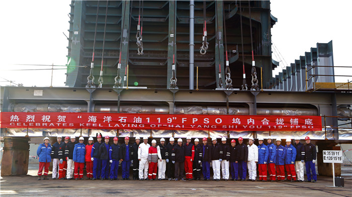 12月31日下午,北船重工新承接的流花16-2油田群開發項目“海洋石油119”FPSO船體建造工程在造船1號塢按期合攏鋪底。這是北船重工繼2007年成功交付10萬噸級海上浮式生產儲卸油船“海洋石油115”之后,時隔11年重新進入FPSO新建造市場。該工程于今年6月簽約、開工。北船重工為此專門成立了流花FPSD項目部,嚴格按照生產節點計劃,抓好工程安全和質量工作,并定期組織周檢、月檢,實施HSE管理創新工程,嚴把質量制造關,確保了工程順利推進。北船重工副總經理鮑會勇和業主、總包方代表,CCS船級社代表、BV船級社代表,以及部分造船部門的領導和職工出席了開工儀式。
