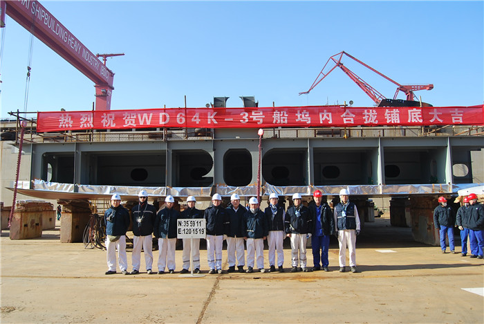 2018年12月28日上午,武船集團北船重工承接的出口項目――6.4萬載重噸木屑運輸船3號、4號船,在2號造船塢內先后實現合攏鋪底,至此,承北船重工建的4艘6.4萬載重噸木屑運輸船已全部按照生產節點計劃順利推進。北船重工副總經理周向陽和船東代表及相關監造人員、驗船師,NK船級社代表以及公司相關部門負責人出席了鋪底儀式。