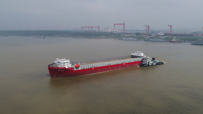 武船集團雙柳武船承建的該型船共四艘,1號船已于2018年5月16日在江蘇省南通市順利交付。13000DWT甲板運輸船是國內首個具備完全自主知識產權的散貨船,采用海工院自主研發的雙尾鰭專利船型,全鋼制焊接結構,總長約130米、型寬26米、型深8米,載重量13000噸,設兩臺主機,單機最大功率1600KW,航速10.2節。在設計方面,海工院通過優化線型設計,其性能參數與國際同類型船舶相比節能提效14.1%,優勢明顯,并通過優化船舶綜合布置,細化施工設計,成功攻克淺吃水型船舶重量重心與穩性控制、薄板焊接變形、船舶減振降噪等難題。該項目質量控制上,受到船東、船檢的一致好評。