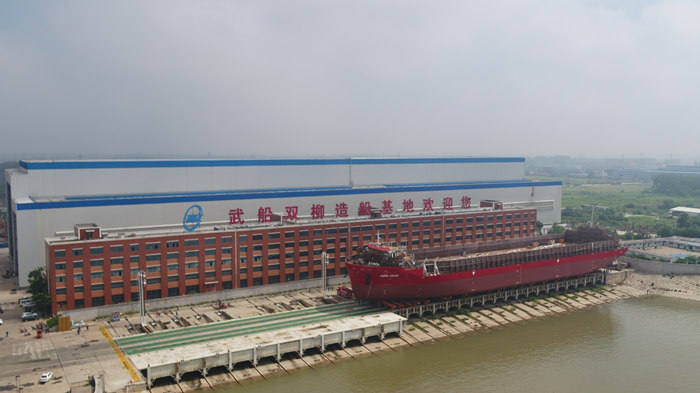 6月1日上午9時28分,由武船集團海工院設計、雙柳武船承建的13000DWT甲板運輸船2號船駛離雙柳武船基地2號系泊試驗碼頭,前往南通瑞泰基地進行最后的交付工作。當天下午3:00整,13000DWT姊妹船3號船沿著雙柳基地滑道,順利下水。