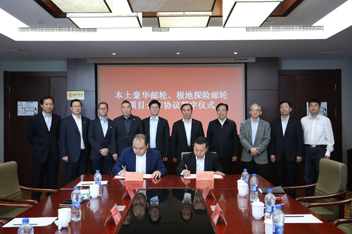 5月24日,武船集團與精英郵輪簽署了“本土豪華郵輪、極地探險郵輪項目合作協議”。武船集團黨委委員、北船重工總經理韓兵與精英郵輪董事長張鵬代表雙方簽約,青島市李滄區委書記王希靜,武船集團黨委書記、董事長楊志鋼出席并見證了簽約儀式。