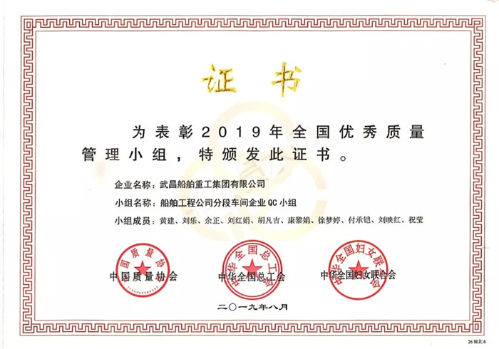 ▲船舶公司分段車間企業號QC小組獲得“2019年全國優秀質量管理小組”榮譽稱號