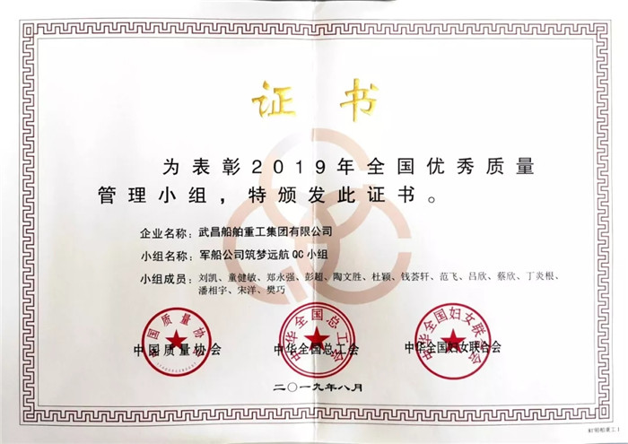▲軍船公司筑夢遠航QC小組獲得“2019年全國優秀質量管理小組”榮譽稱號