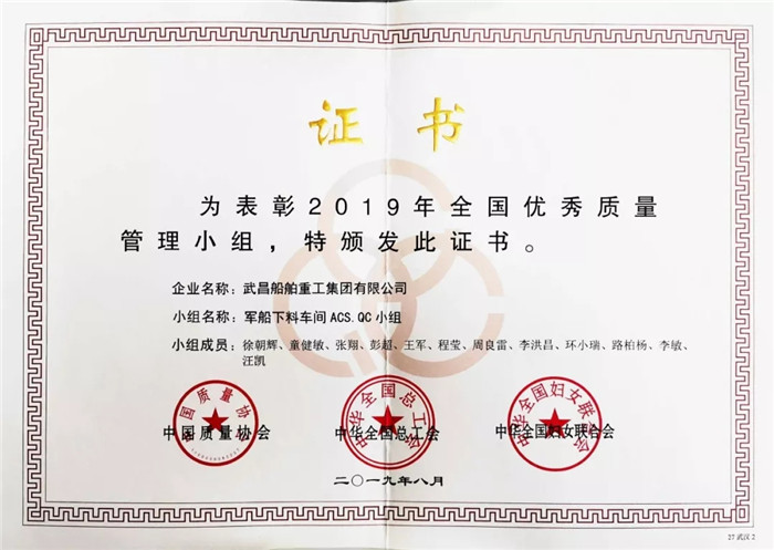 ▲軍船公司下料車間ACS.QC小組獲得“2019年全國優秀質量管理小組”榮譽稱號