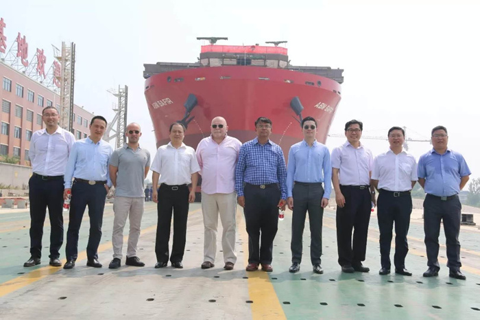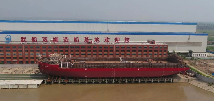 7月24日上午10時(shí)18分,烈日炎炎,彩旗飄動(dòng),由雙柳武船承建的13000DWT甲板運(yùn)輸船最后一艘4號船在雙柳基地下水。船東代表法國路易達(dá)孚海運(yùn)集團(tuán)公司艾米力?杜,武昌船舶重工集團(tuán)有限公司副總經(jīng)理田軍,武船集團(tuán)雙柳武船黨委書記、董事長楊國平等參加了下水儀式。4號船的順利下水,標(biāo)志著在雙柳武船全體員工努力下,在設(shè)計(jì)師、工程師和驗(yàn)船師的積極幫助下,13000DWT項(xiàng)目進(jìn)入全面收官的關(guān)鍵沖刺階段。