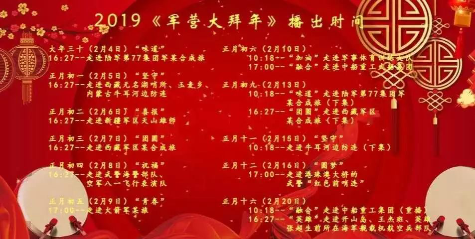 《“融合”走進中船重工武船集團》將于2月9日,大年初五8點檔在央視一套和央視三套共同播出。2月10日,大年初六17:00-18:00在央視七套播出。下面是《軍營大拜年》節(jié)目在央視七套的播出時間表,敬請觀看!