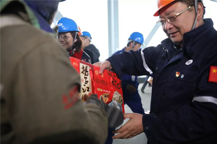 ▲為項目現(xiàn)場施工人送上春節(jié)慰問品