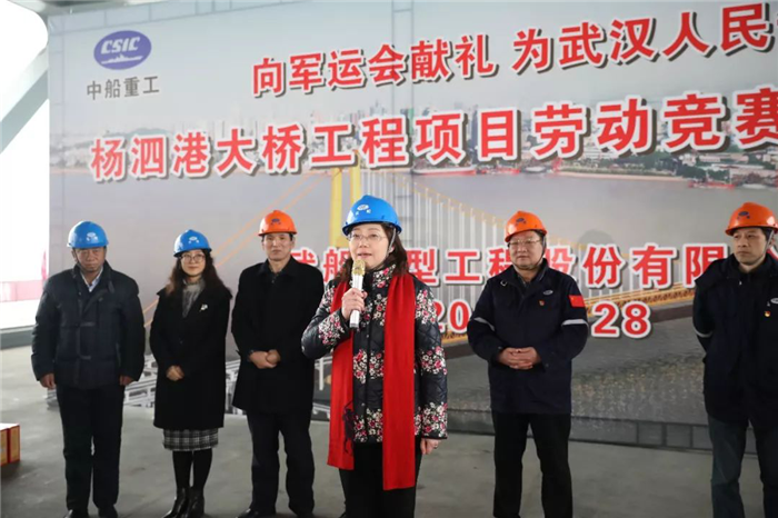 王芳強調(diào),最近兩年,市總工會組織百萬職工,在重點項目、重點領(lǐng)域建設(shè)中,全面深入開展勞動競賽,“創(chuàng)業(yè)創(chuàng)新創(chuàng)優(yōu),聚力拼搏趕超”、“當(dāng)好主人翁,建功新時代”等主題深入人心,為武漢市高質(zhì)量發(fā)展做出了重要貢獻。這次聯(lián)合武船打響了武漢市2019年“當(dāng)好主人翁,建功新時代”勞動競賽活動第一槍,希望通過活動,加快武漢市重點工程建設(shè)的推進,為第七屆世界軍人運動會提供有力保障。