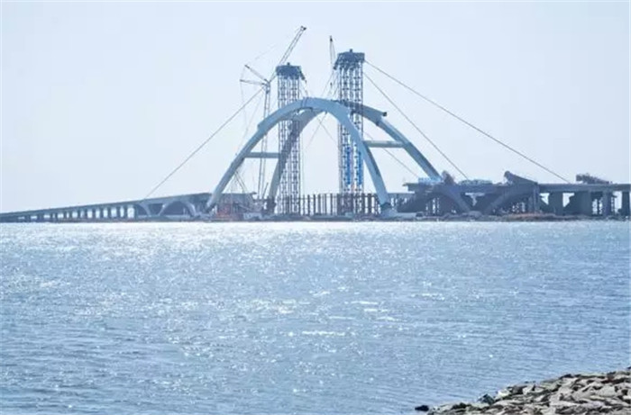 盤錦橋中橋和東橋合同總噸位1.24萬噸,其中中橋位于沿海內湖,整個項目施工區域均在回填的軟基土上進行,施工難度巨大,該橋全長2310m,主橋鋼拱肋結構形式復雜,拱肋矢高69m,跨徑200m,拱徑重約4000余噸。