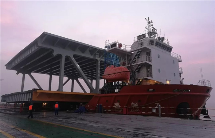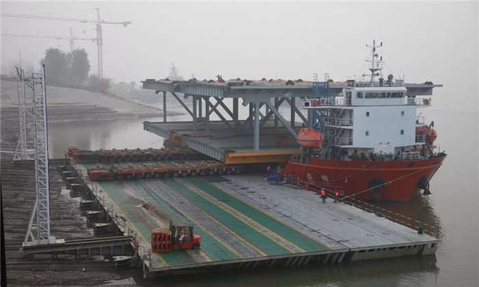 斜船架經(jīng)過45分鐘的下行,滑行到達(dá)指定水域,等待的運(yùn)輸船舶盛暢7#迅速起錨靠近斜船架,固定纜繩、對準(zhǔn)搭接通道、左舷壓水,項(xiàng)目部、起重運(yùn)輸部和雙柳公司等20余人的發(fā)運(yùn)團(tuán)隊(duì)各就各位,各司其職,一系列的準(zhǔn)備工作嫻熟而利落。隨后操作人員啟動模塊車,在指揮人員的指令中,緩緩上船。3排軸線上船后,船右舷傾斜下沉,對講機(jī)中不斷傳來操作指令:斜船架1檔下行、停止、左舷繼續(xù)壓水、模塊車低速前進(jìn)……,模塊車前輪越過中線后,船體逐漸向左舷復(fù)位傾斜,對講機(jī)中操作指令又不斷清晰傳來:斜船架上拉、左舷壓水停止、模塊車?yán)^續(xù)前進(jìn)……。