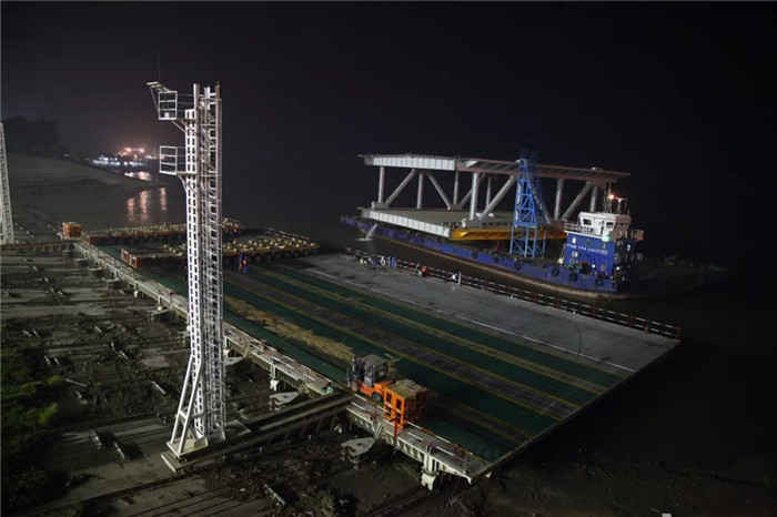 21時(shí)30分,盛暢7#船舶已經(jīng)在橋址卸下分段,馬不停蹄返回武船雙柳廠區(qū),停泊待裝G8W、G9W兩節(jié)分段。