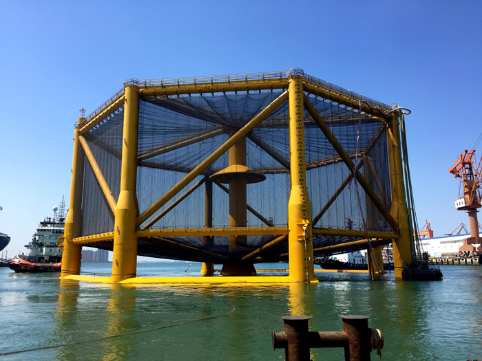該深海漁場船東為日照萬澤豐漁業公司,預定作業海域位于山東省日照市以東130海里的黃海冷水團海域,距青島約110海里。拖航需要大約20個小時。“深藍一號”到達作業海域后將進行升降試驗和各項調試工作。海工院設計人員隨船一同出海并將在投入使用前持續提供現場技術支持。預計本月內即可開始三文魚養殖作業。
