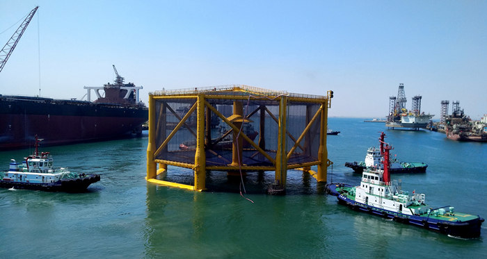 5月31日下午2時,在4艘拖船的簇擁下,由武船集團海工院設計,武船集團北船重工青島武船建造的國內首座全潛式深海漁場“深藍一號”緩緩離開廠內臨時泊位,踏上了前往黃海作業海域的航程。