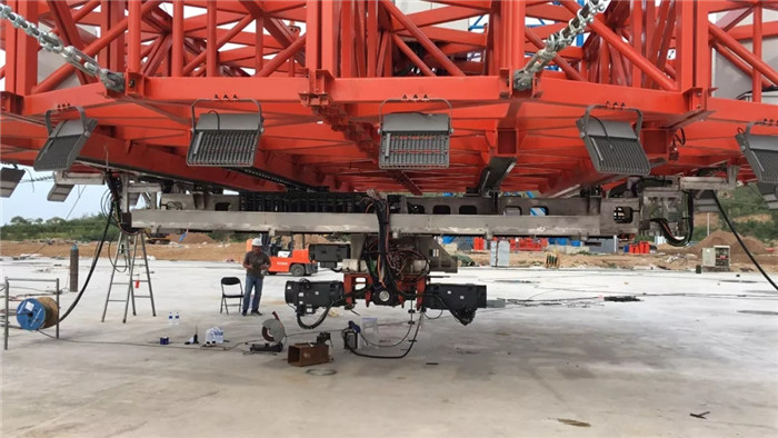 2019年7月初,“隨動盤”在武船集團重裝公司廟山基地順利完成組裝及檢測實驗,并立即拆分裝箱發往懷來?!半S動盤”上安裝的導軌平面度公差達到0.1mm、平行度公差達到0.15mm ,各項檢測數據滿足工藝精度及試驗要求。