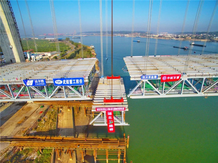 11月15日上午,隨著白洋長江大橋最后一片鋼桁梁吊裝到位,由武船重工股份承建的白洋長江大橋主橋實現合龍。