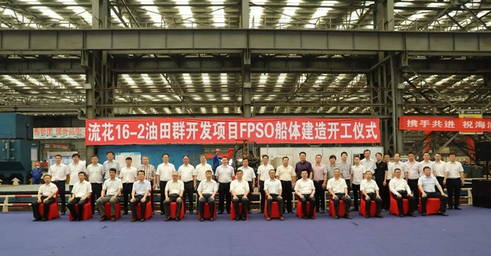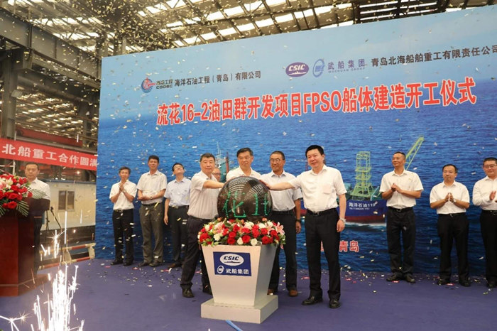 6月27日,武船集團北船重工新承接的 “流花16-2油田群開發項目FPSO船體建造”工程在北船重工船體制作部聯合廠房正式開建。武船集團北船重工總經理韓兵主持開工儀式,青島西海岸新區副區長隋斌,中海石油(中國)有限公司深圳分公司副總經理樂鉆,海洋石油工程股份有限公司董事長金曉劍,武船集團總經理、北船重工董事長陳?劍?共同啟動開工按鈕。
