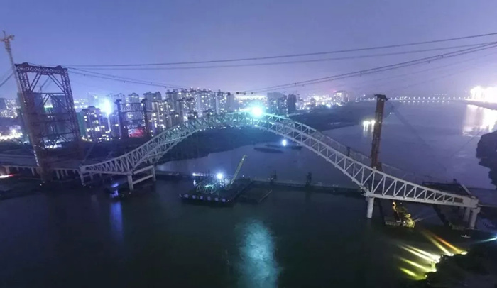 整個鋼桁拱施工過程,先后受到征地拆遷、漢江秋汛封航、枯水航道受阻、兩次強降雪等影響,工期形勢一度嚴峻。面對困難,武船重工股份科學組織,認真謀劃,充分發揮臨時黨支部的作用,掀起了以黨建為引領的勞動競賽,從內部挖潛,從管理入手,細節性地優化施工工序,適時增加作業班次及施工作業人員,科學調整作業時間,使拱肋從卸船、翻身至吊裝完成時間從每3天1件,提高到1.5~1天1件,風撐分段從每3天1件提高到每2天一件,更創造了12、13分段6件拱肋節段一天完成的奇跡。期間,公司領導多次到現場檢查、指導、協調解決問題,加強調度管理,調動一切有利于施工生產的資源配置,24小時不間斷作業,在工期滯后的不利條件下,按計劃實現了主拱合龍節點。針對該橋安裝復雜、施工工序多,高空立體交叉作業多等特點,公司項目部采取多項措施確保安全與質量受控。