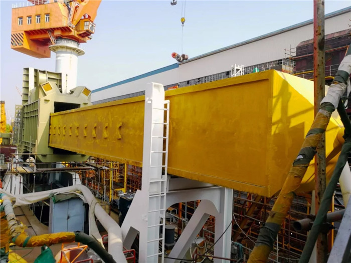 項(xiàng)目現(xiàn)場安裝負(fù)責(zé)人介紹,長度35米、重110噸的巨型鋼樁與鋼樁套方孔之間的間隙不足10毫米,兩者之間的交會(huì)對(duì)接過程猶如高空“穿針引線”,難度很大。為此,模塊公司針對(duì)關(guān)鍵吊裝過程,科學(xué)設(shè)計(jì)制作了系列吊運(yùn)移位和微調(diào)定位工裝,綜合起重模式動(dòng)態(tài)轉(zhuǎn)換、船舶甲板位置精準(zhǔn)裝配、空間相對(duì)位置測量等多種力量手段,長度35米的鋼樁精準(zhǔn)穿入船艉左舷的固定鋼樁套。檢測結(jié)果顯示,鋼樁與鋼樁套間的安裝精度全面達(dá)到了技術(shù)要求。