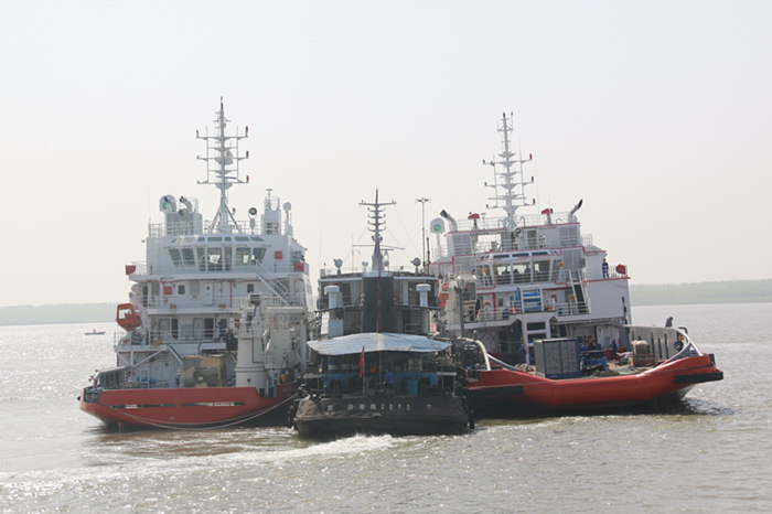 4月8日上午9點28分,由武船集團雙柳武船承制的三型七艘船中45米WUV-4號船和58米AHTS-2號船同時駛離雙柳基地1號系泊試驗碼頭前往南通順泰基地。