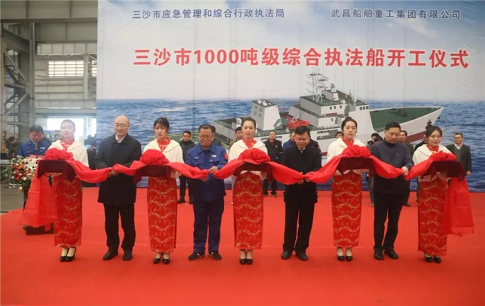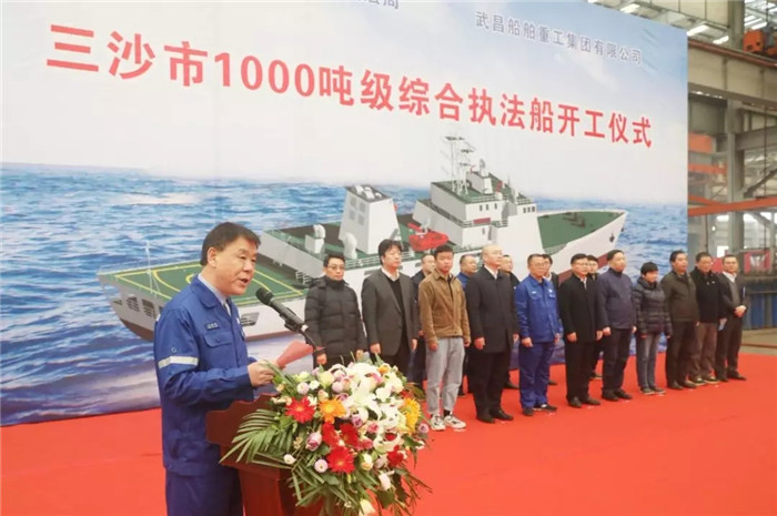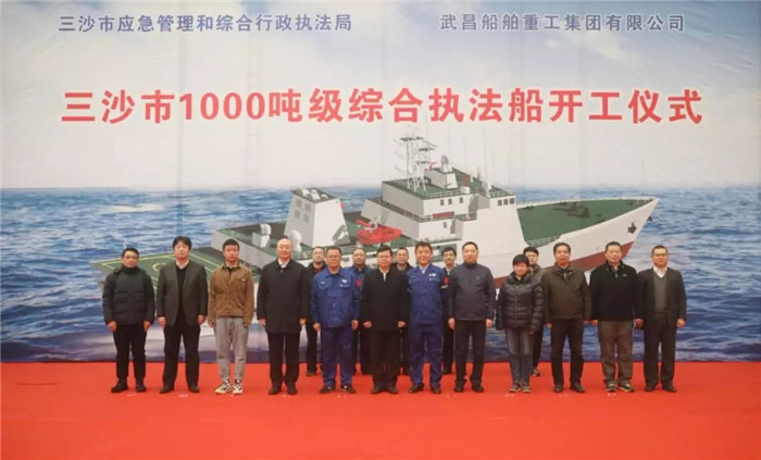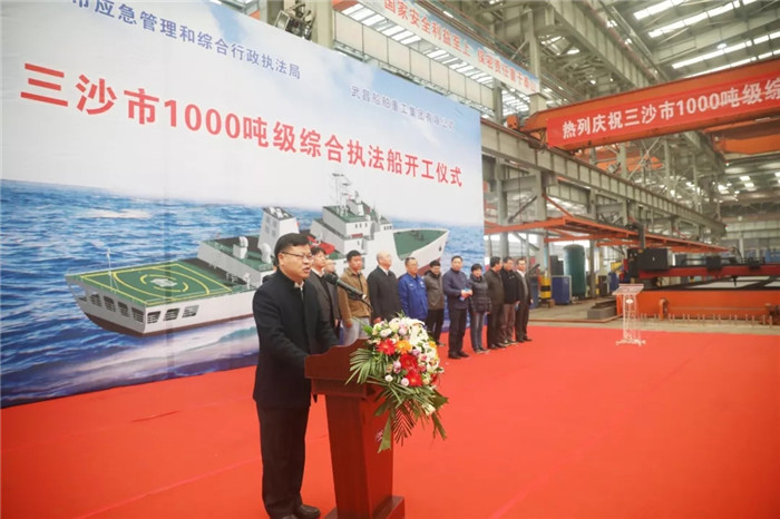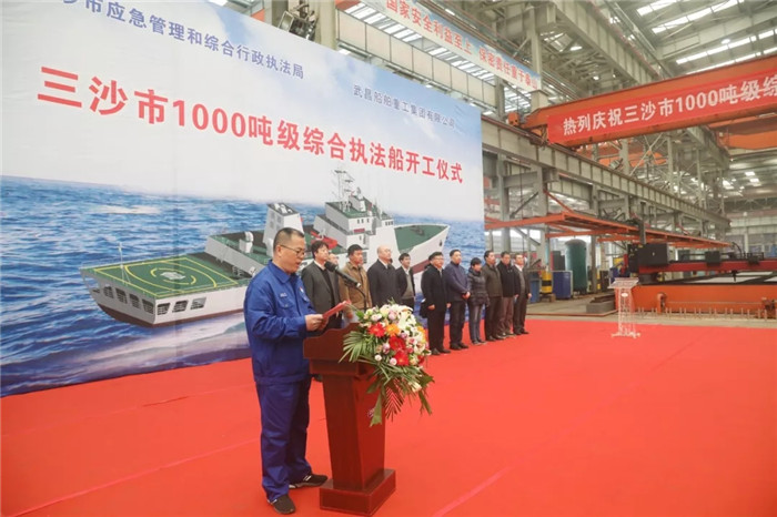 2019年12月2日上午10點08分,三沙市1000噸級綜合執法船開工儀式在武船集團雙柳基地順利舉行。
